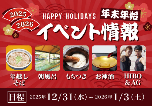 12/29(月)〜1/4(日)は、土日祝価格:大人 1,500円 / 子ども 800円にて営業いたします。また、元日1/1(木)は朝7時より「朝風呂」特別営業!